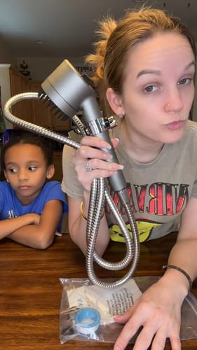 Schrauben Sie die mitgelieferte Halterung mit dem beiliegenden Teflonband an Ihr Duschrohr, um einen dichten und leckagefreien Sitz zu gewährleisten.